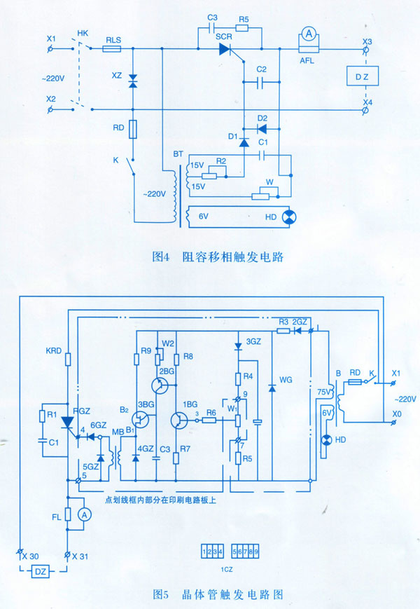 圖4所示為阻容移相角撥電路原理圖,圖5所示為晶體管觸發(fā)電路原理。其它如需各種 形式的自動(dòng)控制電控箱,可按要求制作。七、隨機(jī)技術(shù)文件
